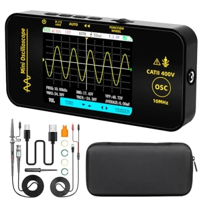 FAST OSCILLOSCOPE: BSIDE OT3 digital oscilloscope with 10MHz bandwidth, 48MSa/S real-time sampling rate, 128Kb storage depth, ±400V measurement range, offers adjustable trigger modes, fast auto or manual waveform capture, such as sine, square, triangle, sawtooth, full, half, noise, and multi-frequency tone etc. EASY TO USE: In addition to automatic waveform imaging, this new oscilloscope is primarily intended to be simple and smooth to operate, with all functions accessible via only 4 buttons. Side wheel buttons are also available to assist with quick operation. ULTRA SLIM AND MINI: This handheld scope is stylish and compact, with ultra-slim design, 12.9*6.3*2.2cm in size. it can be easily slipped into your pocket and comfortably in one hand while taking a measurement on site or on the move. 3.2-INCH FULL VIEW DISPLAY: Despite small size, this compact oscilloscope features a super large colour TFT screen, bright readings and waveforms are very clear and easy to read at any angle. Waveforms can be saved with a single click and viewed on this unit or on a PC. WHAT YOU GET: The portable oscilloscope comes a built-in 1200 mAh rechargeable battery to support more than 8 hours of continuous diagnostic work. Package includes: 1*oscilloscope, 1* BNC oscilloscope probe, 1* BNC to alligator clip probe, 4* colour ring, 1 *charging cable, 1*carrying case, 1* alignment screwdriver. And subsequent firmware upgrades are available.