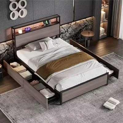 【Single Bed with 4 Drawers】Underbed drawer is fitted with castors for effortless pushing and pulling. The single bed frame provide extra storage space to keep things tidy. 【USB Charging Ports】3 USB charging ports of the single bed are thoughtfully prepared at the bedside, including two 2 Type-A and one Type-C, 5V / 2A. 【LED Light Strips】The light strip can be adjusted with three levels of brightness and a variety of colours, and can be controlled by remote control, mobile app, and Bluetooth. Elevate your sleep experience with the integrated LED light strip, casting a warm and inviting glow over your resting space. This modern touch not only illuminates your surroundings but also adds a touch of elegance to the overall design, making it a true statement piece. 【High-quality Materials】Its rustic wood finish imparts a cozy charm, enhancing the ambiance and creating a warm and welcoming environment. The metal bed frame is crafted with meticulous attention to detail, this single bed boasts a robust metal frame that promises steadfast durability, ensuring it stands the test of time. Effortlessly blending into a range of interior decors, this versatile metal bed frame is a must-have for homeowners who appreciate both comfort and aesthetics. 【Easy to Install】Detailed instructions and complete parts are available to help you complete the assembly. The fun of installation makes you enjoy the metal single bed more.
