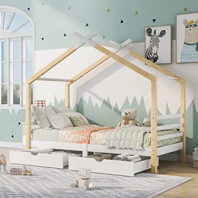 This White and Wooden colour Pine wood Kids canopy beds frame included 2 drawers Adapt to any decoration style: A real winner among childs and parents! Its match for any decorate even a car or a spiderman for boy or peppa pig for girl with this low children's bed according to your girl or boys favourite style to create a beautiful castle for your children. This floor teepee toddlers day bed frame comes with drawer, both the head and the end have rail guard protector, to satisfy the safety from a junior or a teenagers ,Superior Quality: The bed is well made and non-toxic paints are used. Expertly crafted from solid pine wood, pinewood veneers on select finishes, and engineered wood. All wood is kiln-dried for added strength and lasting beauty. This childrens bed Make Full Use of Space: This creative design could save your space and provide you with more flexible usage. Convenient space is offered for baskets and boxes to store items like extra bedding, seasonal clothing, toys, and more out of the way to keep them easily accessible make the bedroom cleaner and tidier. This ready beds for kids Stylish & Simple Appearance: Classic color and simple appearance are highly compatible with surroundings, which will highlight your home decor. This lovely bed will be popular with kids. [Fairy tale world] Its Sloping Roof Makes This Bed a Great Feature Piece For Your Children's Room. Inner Size: 90*190cm.Outer Size 96*200*173cm. Package Size(bed):146.5*53.3*12cm,Package Size(drawers):97.6*47.3*12.5cm, Weight: 38kg, Load Capacity: 120kg. This Product Does Not Include a Mattress.Please Kindly Note that the wood house bed comes in TWO separate boxes may arrive on different days. Please wait patiently or contact us freely if you only receive some part of them.