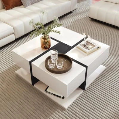 【Elegant Square Design】Our coffee table impresses with its perfectly proportioned square format (78*78*45 cm), which fits ideally into your living room and offers enough space for social gatherings. 【Versatile Storage Space】4 pull-out drawers of the coffee table provide storage space and keeps your surface neat and tidy. The wide shelf space at the bottom allows you to stylishly display your favorite books, magazines or decorative items. 【Robust and Stylish】This coffee table with storage is made of high-quality particle board. The unique geometric pattern of different shades and creative lines gives the coffee table a modern and artistic look that attracts attention. 【Central Highlight】Our coffee table is not only stable, but also aesthetically pleasing - a perfect combination of form and function that combines modernity and elegance to add a touch of luxury to your home. This coffee table will not only be a practical piece of furniture, but also the centerpiece of your living room. 【Modern Taste】Enjoy our latest creation.This coffee table with storage embodies the perfect balance between aesthetics and practicality. This coffee table is not just a piece of furniture, but a statement about your exquisite taste and sense of timeless design.