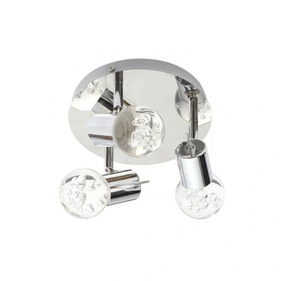 General description Bring decorative lighting to your home with the Bubble 3 Light LED Ceiling Light in Chrome. This 3-light spotlight plate features globe-shaped bubble injected shades with 3 adjustable heads, allowing you to direct the light to suit your needs. Ideal for kitchens or bedrooms, the chrome finish of this ceiling light will blend seamlessly into modern decors. Technical specifications Product Type: Spotlight Plate Bulbs Required: 3 (Integrated) Bulb Type: Integrated LED (Non-Replaceable) Max Bulb Wattage: 15 Watt Max Bulb Voltage: 240 Volt Light Source: LED Height: 13 cm approx. Diameter: 34 cm approx. Drop: 13 cm approx. Lumen: 1050 lm Colour Temperature: 3000K Warm White Energy Efficiency Rating: A++ Material: Metal, Glass Colour: Polished Chrome
