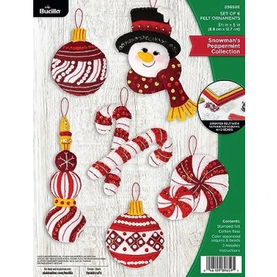 Bucilla, Snowman's Peppermint Collection, Felt Applique 6 Piece Ornament Making Kit, Perfect for DIY Arts and Crafts, 89659E