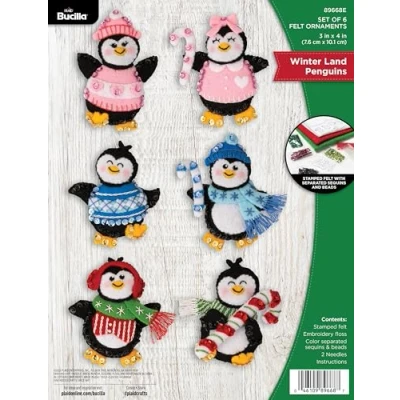 CLASSIC ORNAMENTS - These felt applique ornaments are the perfect addition to your tree for the holiday season. These ornaments approximately measure 3" x 4". FESTIVE DESIGN - This kit features 6 different playful penguin ornaments - perfect for getting into the holiday season! COMPREHENSIVE KIT - This embroidery kit includes the basic materials needed to create ornaments including pre-stamped felt, cotton embroidery floss, separated sequins and beads, 2 embroidery needles, and easy to follow instructions. DECORATE - Enhance your home décor by adding these holiday ornaments to your Christmas tree. CLASSIC BRAND - For over 150 years, Bucilla has helped people all over the world capture the satisfying feeling of creating a hand-stitched heirloom that can be cherished for years to come., Manufacturer: Plaid Enterprises, Inc.