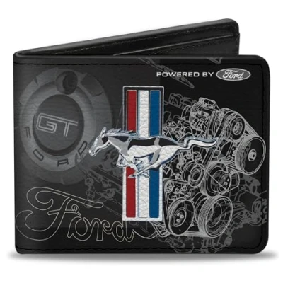 Buckle-Down bifold wallet mustang This great men's wallet is made from high quality vegan leather Measures 4" x 3.5" x 0.5" and features standard bill compartment, 5 card slots and window ID holder This product is officially licensed by Ford