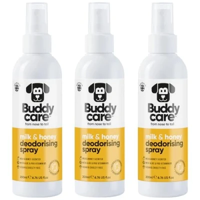 MILK & HONEY DOGGY DEODORISING SPRAY - Freshen up Fido with a milk & honey deodorising spray that helps eliminate doggy odours. No more stinky pooch, just an irresistibly sweet scent wherever they go! NATURALLY DEODORIZES & FRESHENS COAT - Specially formulated to combat bad smells and keep your pooch smelling fresher for longer. Use this doggy deodoriser in between baths to quickly and easily eliminate unpleasant odours and refresh your pup's fur. WITH ALOE & PRO VITAMIN B5 - Buddycare Dog Deodorising Spray is made with a gentle PH balanced formula that's kind to skin, while conditioning agents like aloe vera and pro-vitamin B5 work to nourish and protect their coat. VEGAN & CRUELTY-FREE - Our commitment to animal welfare means that all of our products, including this dog deodoriser, are vegan and cruelty-free, so you can feel good about using it on your furry friend. BUDDYCARE - You know your best friend better than anyone, and Buddycare knows dog grooming like the back of its paws. Our range of dog colognes and deodorisers help make grooming (almost) a walk in the park!