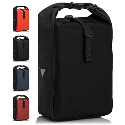 Reflective material for optimal visibility. Dimensions: approx. 48 x 25 x 14 cm Easy to attach to the pannier rack thanks to 2 hanging hooks and Velcro fasteners Side mesh pocket for ideal storage of drinks With adjustable shoulder strap Material: water-repellent tarpaulin and polyester
