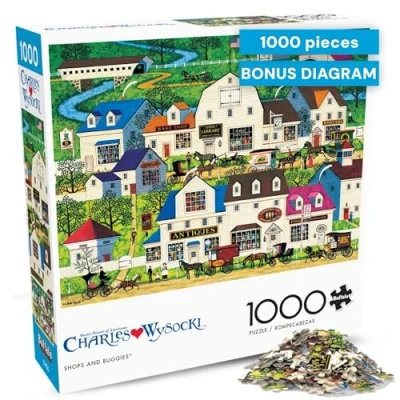 COZY SMALL-TOWN BUILD: Settle into a bright Wysocki village full of storefront signs, buggies, and painted Americana charm. Relaxing to start, then satisfyingly challenging as you match rooftops, windows, and greens—perfect for a quiet night in or puzzle date. PREMIUM RECYCLED BOARD: Made from recycled materials on premium puzzle board with sturdy interlocking pieces that snap together for a secure fit, so sections hold as you sort, lift, and connect your progress with confidence. VIBRANT WYSOCKI ARTWORK: High-resolution printing keeps colors crisp and details clear, making it fun to spot shop names, tiny scenes, and nostalgic touches as the picture comes together. REFERENCE DIAGRAM INCLUDED: Includes a large reference diagram to help you plan and confirm tricky areas. Finished size is 26.75 x 19.75 inches for an impressive, display-worthy result. GIFTABLE SCREEN-FREE FUN: A premium, thoughtful gift for ages 14+ and all skill levels. This 1000 piece puzzle encourages focus, patience, and problem solving while bringing everyone to the table., Manufacturer: Buffalo Games