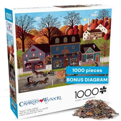 RELAXING, SAVOR-THE-MOMENT PUZZLING EXPERIENCE: Settle in for a cozy, rewarding puzzle session with a detailed village street scene that encourages you to take your time and enjoy every piece—perfect for quiet evenings, weekend unwinding, or a relaxed puzzle night at home. CLASSIC CHARLES WYSOCKI ARTWORK: Features the nostalgic Americana style Charles Wysocki is loved for, filled with colorful storefronts, horse-drawn carriages, and autumn trees that reveal charming details as the image comes together. PREMIUM QUALITY YOU CAN FEEL: Made with thick, premium puzzle board and precisely cut pieces that fit together smoothly and stay flat, creating a satisfying build from the first connection to the final piece. FULL-COLOR POSTER INCLUDED: Includes a full-color reference poster to guide assembly and help you appreciate the intricate details woven throughout the scene. MADE IN THE USA WITH RECYCLED MATERIALS: Proudly manufactured in the USA using recycled materials, combining thoughtful craftsmanship with a durable, display-worthy finished puzzle size of 26.75 x 19.75 inches., Manufacturer: Buffalo Games