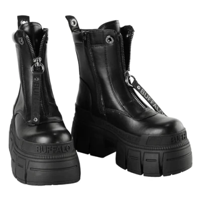 Maximum comfort support: Features an advanced memory foam footbed that contours to your foot, providing exceptional cushioning and arch support for an individualized, comfortable fit throughout the day Modern vegan design: Expertly crafted from smooth, water-based vegan nappa in a deep black finish, offering a cruelty-free and environmentally conscious option. The central vertical zipper adds a distinctive, contemporary aesthetic Bold platform style: Boasts an ultra-high, multi-textured platform sole with pronounced lugs and etched branding, creating a commanding silhouette that elevates any outfit, from casual to fashion-forward ensembles Secure and convenient fit: Designed with a functional front zipper for quick and easy on-and-off access. The ankle-height shaft and padded collar provide comfortable support without restricting movement Durable grip sole: Equipped with a rugged, slip-resistant rubber outsole featuring deep "Buffalo" branding and geometric patterns, ensuring reliable traction and long-lasting stability on various surfaces