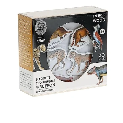 We are very proud of this collaboration Vilac x National Museum of Natural History. Georges-Louis Leclerc, Count of Buffon, (1707-1788) directed the Royal Garden of Plants for nearly fifty years, from 1739 until his death: his natural history, in 36 illustrated volumes, is a success from its release. The animal representations in the book have served as inspiration for fine arts, fashion, decoration, educational and youth books. This testifies the Le Buffon lotto game: illustrated lotto game, adorned with all species published in Paris at Appert Son and Vavasseur around 1840. The 96 animal figures present on the 24 boxes that make it up have been made by Nicolas Fleuri Jannin. These magnets are inspired by illustrations in the game of lotto, which one copy is kept at the National Museum of Natural History, within the collections of the Directorate of Libraries and Documentation.