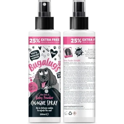 Long Lasting Baby Powder & Aloe Vera Fragrance dog dry shampoo - makes your smelly dog smell great! Bugalugs perfume spray helps your dog smell fabulous in between washes with a long-lasting freshness. For the ultimate grooming experience, complement your Bugalugs spray with our matching dog shampoo to leave your beloved canine companion looking and feeling their absolute best! Refresh your dogs coat on the go! - Ideal for use after bath time, between baths, or on the go, our Bugalugs baby powder dog spray is travel friendly and great for popping in your bag or car. Dog deodorant spray is gentle on skin and packed with ingredients that hydrate and nourish the coat, with a long lasting scent, our fast-drying finishing dog perfume spray and dog scent spray pampers your pets coat and skin with a nurturing touch 25% Extra Free - more of the scent you love! Beloved by professional groomers, Bugalugs dry dog shampoo dog perfume are the go-to grooming products for dogs Vegan Friendly & pH Balanced Formula - Bugalugs dog deodorant spray for smelly dogs is safe and effective for dogs of all breeds, including puppies over 8 weeks old. Our customer's love our 'baby smell spray' and professional dog groomers note that the scent lasts for days! Trust in Bugalugs baby cologne dog fragrance spray to leave your pet smelling and feeling like they've just stepped out of a high-end salon!. Use alongside our other grooming products for dogs these include dog shampoo for smelly dogs, dog conditioner, puppy shampoo and dry shampoo for dogs