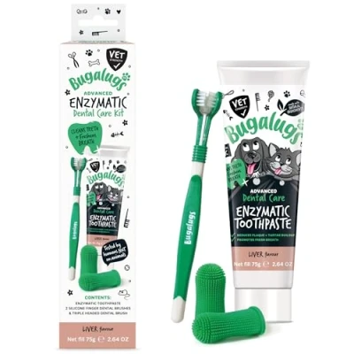 Smart solution for all your doggy toothpaste dental needs - Dog breath treatment is simple to use with a liver flavour. Bugalugs dental care kit contains dog toothpaste and brush plus dog toothbrush finger all you need for the effective removal of plaque and tartar, helping to avoid painful sore gums and potential costly vet bills One stop oral dog dental care & cat teeth cleaning remedy - the Bugalugs dental Kit contains two silicone dog finger toothbrush and dog tooth brush for easy and gentle dogtooth cleaning, one triple headed dog tooth brush that wraps around the tooth for deeper cleaning, and our enzyme toothpaste - simple pop a blob of cat toothpaste & dog toothpaste onto your chosen brush and gently rub. Daily use of a dog toothbrush and toothpaste and cat toothbrush and paste can act as a cat and dog bad breath treatment, eliminating odours and leaving breath smelling fresh a great dog plaque remover for teeth Cleans teeth & freshens breath for a pawfect smile - an oral care routine is important for the health of your pets mouth. Dog toothpaste for tartar removal is simple to use for both dog & cat, our enzyme toothpaste leaves teeth cleaner, helping to avoid painful gums and acting as a plaque remover for teeth dogs and bad dog breath remedy puppy toothpaste Trusted UK brand for all your pets needs - made with Natural Ingredients in the UK with enzymes to ensure fresh breath for dogs, Protease & Glucose Oxidase help act as a plaque remover for dogs to remove tartar build-up. Manufactured in our GMP certified factory in the Lake District to the highest standards to ensure the best care for your pets; pair with our other dog dental stuff from our range of products for cats and dogs, including seaweed for dogs teeth, dog breath freshener in water, dog breath spray & dog dental wipes Use alongside bugalugs no 1 best selling pet dental health supplies for dogs – our bad breath treatment for dogs include, dog dental chews, enzymatic toothpaste dogs, dog mouthwash, dog dental powder & puppy toothbrush and paste