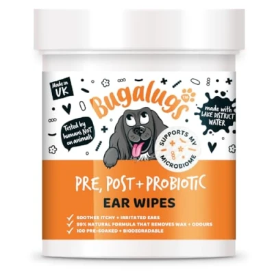 BUGALUGS Probiotic Dog Ear Cleaner Pet Wipes 100 Biodegradable textured pre soaked wipes. Solution Stops Head Shaking, Itching & Waxy Ears (Dog wipes)