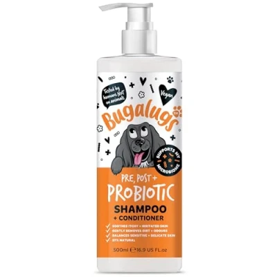 Pre, Post & Probiotic Dog Shampoo - helps balance the skin’s natural microbiome for a happier, healthier pet Bugalugs is Loved by Over 1 Million Dogs – and dog owners to support their dog’s health by helping to support itchy & irritated skin, balances Sensitive & Delicate skin & coats Probiotics support good bacteria - that help neutralise bad odours and soothes itchy & irritated skin. Gently cleans and hydrates the coat Best-in-Class Ingredients – Packed with amazing natural ingredients, including Prebiotics, Postbiotics, Probiotic, Pumpkin, Oats, Blueberry, Aloe Vera & Linseed to help support your pets skin & coat Brought to you by the UK's No1 Best Selling pet grooming brand Bugalugs - Our natural Dog Shampoo is suitable for all breeds and great for small dogs, medium dogs & large dogs over 12 weeks old