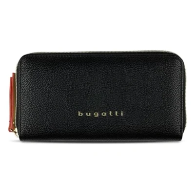 DESIGN — The bugatti Ella Ladies Zip Around Wallet impresses with its elegant and timeless look, making it a stylish companion for everyday use. ORGANISATION — Features a practical compartment layout with 8 card slots, 2 bill compartments, 2 side pockets, and a zip coin pocket for optimal organisation. MATERIAL — Made from high-quality, grained polyurethane, the wallet offers a durable and pleasant tactile experience. SECURE CLOSURE — The wallet is securely closed with a zip, keeping your valuables safe and easily accessible. DETAILS — Gold-coloured logo and zip details add a touch of sophistication to the classic black design.