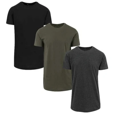 Build Your Brand Men's Shaped Long Tee 3 Pack T Shirt, Multicolour (Blk/Cha/Oli 02280), X Small