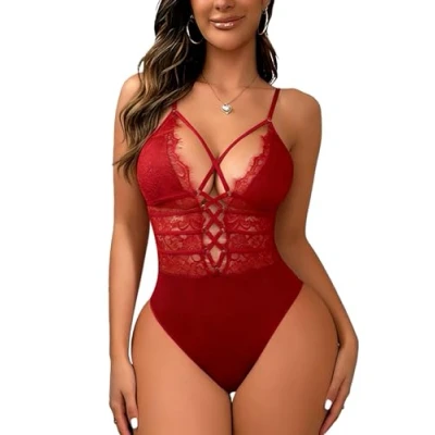 Buitifo Women Sexy Bodysuit One Piece Babydoll Lingerie Lace Teddy Negligee (Red S)