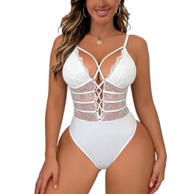 Buitifo Women Sexy Bodysuit One Piece Babydoll Lingerie Lace Teddy Negligee (White,S)