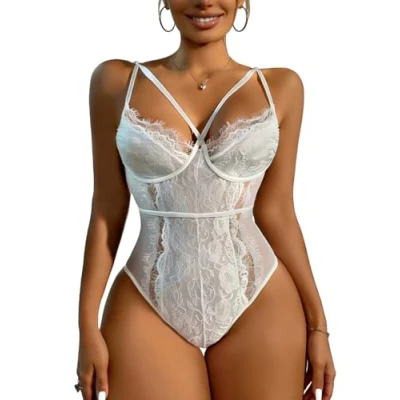 Buitifo Womens Sexy Bodysuit Lingerie One Piece Babydoll V Neck Teddy Snap Crotch (White,S)
