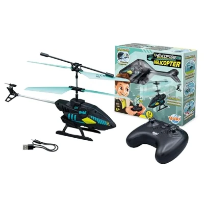 A remote-controlled helicopter that is easy to fly indoors or outdoors 2.4Ghz Remote Control The helicopter stabilises on its own thanks to its built-in gyroscope Powered by a lithium battery that is charged by USB. Requires battery in the LR03*2 remote control Length 23 cm, instructions illustrated in colours, from 8 years, Manufacturer: BUKI France