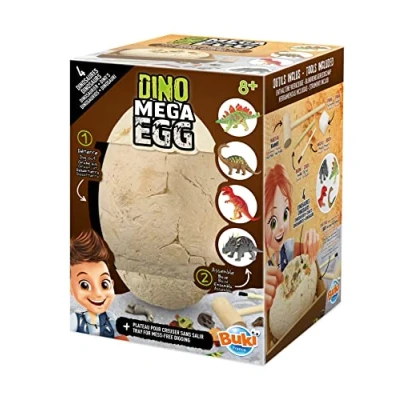 MEGA DINOSAUR EGG - Get ready to dig with this huge 20cm Mega Egg from Buki! Use your best demolition skills to uncover four dinosaur puzzles, with parts of a Tyrannosaurus Rex, Diplodocus, Stegosaurus and Styracosaurus scattered throughout the egg! 4 DINOSAURS INSIDE - 4 x 10cm dinosaur puzzle are to dig up: Brachiosaurus, Stegosaurus, Styracosaurus and Tyrannosaurus. BUILD THE DINOSAURS - Once you’ve uncovered all the parts enjoy putting these together just like a real archaeologist! Including wooden digging tools, colourful fact booklets and a tray to contain the mess, this Mega Egg will provide hours of entertainment for dinosaur fans both young and old! MESS FREE PLAY - Say goodbye to worries about mess! The kit includes a convenient tray, ensuring a tidy and systematic digging experience. ILLUSTRATED COLOUR INSTRUCTION MANUAL - The steps are detailed and explained in a full colour package with easy-to-understand photos and diagrams. GIFT FOR CHILDREN 8+. This Dino Mega Egg Dig Kit is suitable for children aged 8 years and over., Manufacturer: BUKI France