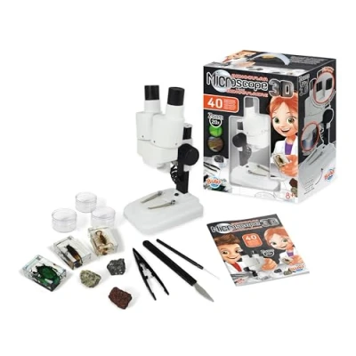 BINOCULAR MICROSCOPE to observe samples in 3D LED LIGHT for high-quality observation 40 EXPERIMENTS included and explained step by step in an instruction sheet in colour ACCESSORIES INCLUDED: samples, tweezers… RECOMMENDED AGE: 8 years +. Requieres 2 AA batteries, not included, Manufacturer: BUKI France