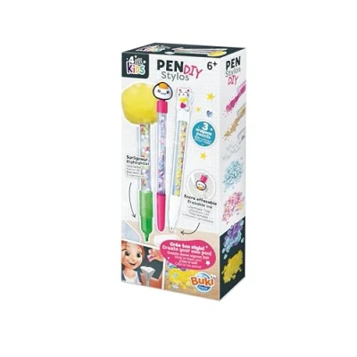 A kit to customize 2 erasable ink pens and 1 highlighter Compatible with pen factory (FK007) but can be used separately 3 models available: Kawaii, animals and food Contains: 2 friction pens with 4 ink tips, 1 highlighter, 1 funnel, 1 pompom, 2 figurines, assorted sequins and From 6 years old, Manufacturer: BUKI France