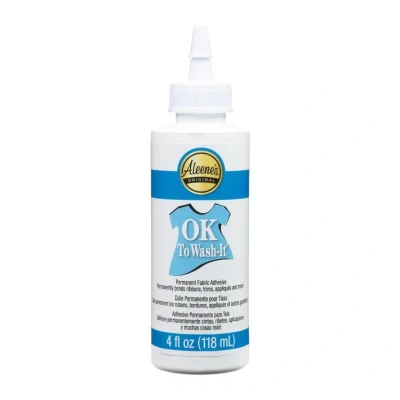 Aleenes 4oz Ok To Wash Ever wonder if it s okay to wash that fabric glue you re using? Aleene s OK To Wash-It says it all in the name! This permanent fabric glue is great for adhering fabrics and embellishments in a nontoxic, machine-washable formula that dries clear and flexible. Use it for embellishing costumes, home d cor fabrics and much more! Permanently bonds ribbons, trims, appliqu s and more to fabric Nontoxic Machine washable Flexible hold Dries clear and won t yellow over time. IL15633 MPN 15633