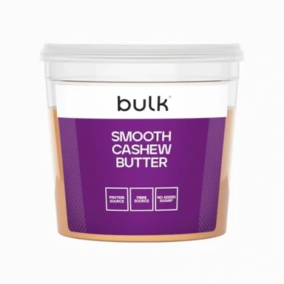 Premium cashew butter that's a source of protein and full of flavour Powered by 18 g protein and 573 kcal per 100 g Manufactured exclusively for Bulk and made from 100% whole roasted cashew nuts for a smooth, rich taste Perfect for bodybuilders or anyone looking to bulk up A natural butter made without salt, sugar, palm oil or preservatives