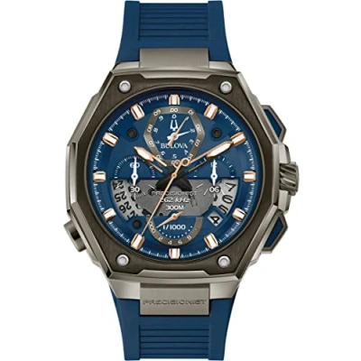 The stylish men's watch from Bulova is a real eye-catcher and can be worn with any outfit The high-quality blue silicone strap with pin buckle fits comfortably on the wrist The blue dial is protected by high-quality sapphire glass The high-quality stainless steel case has a diameter of 45 mm The watch has a water resistance of 30 bar