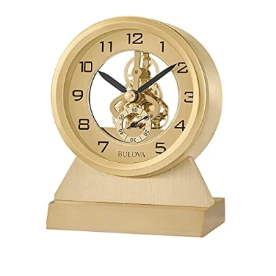 AmazonSolid Metal Brushed brass finished case Skeleton movement with remote seconds dial Heavy base can be engraved or the included brass plate can be used. Engraving plate is .5” x 3.75” Operates on (1) AA battery, not included One (1) Year Limited Manufacturer’s Warranty