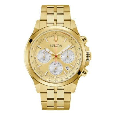 Bulova is renowned for their legacy of industry innovations and a history of firsts, since 1875 The faceted gold-tone stainless steel case features a mix of brushed and polished finishes with a flat mineral crystal; the polished gold-tone hands and markers with luminescent fill provide superior legibility 45 mm Case Diameter 100 m water resistant 3 year Bulova UK Warranty