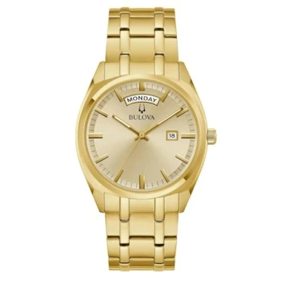 The Bulova men’s Surveyor is defined by exceptional quality and sophisticated aesthetics. This Analogue watch features a calendar function: Day-Date and is equipped with Luminous Hands High quality Gold Stainless steel strap, measuring 21 cm in length and 21 mm in width, with a Fold over with push button clasp. Case diameter: 39 mm,case thickness: 10 mm, case colour: Gold and dial colour: Gold Water resistant: 3 bars-Weight: 139 g The watch is delivered in an original gift box and has a warranty of 2 years