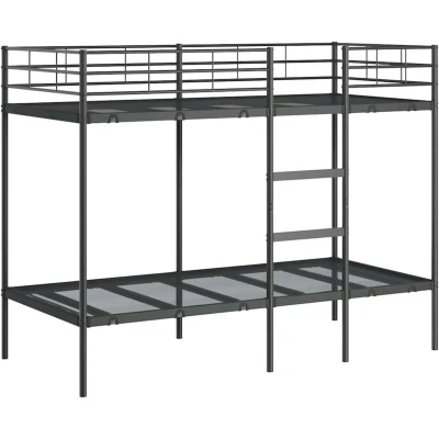 ManoManoGeneral description This bunk bed is a space-saving solution with two beds in one, making it ideal for accommodating guests, sleepovers, and families with multiple children. The robust metal construction ensures exceptional sturdiness and stability, while the breathable mesh fabric base provides excellent support for your mattress. Technical specifications Colour: Black Material: Steel, mesh fabric Overall dimensions: 207 x 90 x 150 cm (L x W x H) Suitable mattress size: 90 x 200 cm (W x L) (mattress not included) Max. mattress thickness: 11 cm Guardrail height: 31 cm Sleeping height from the ground: 30/119 cm Assembly required: Yes Usage This loft bed features a built-in ladder for easy access. Equipped with guardrails for enhanced safety to prevent falls. Other information Warning: To prevent tipping, this product must be used with a wall attachment device (not provided). The upper bed is not suitable for children under 6 years old. It is advised to use screws and plugs suitable for