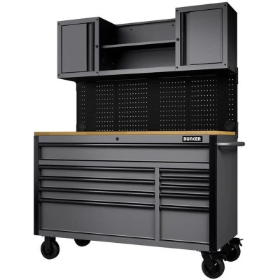 If you are looking for the perfect tool storage solution for your garage or workshop, look no further than the BUNKER 56"" roller workstation with a workbench and 10 drawers. Manufactured from high-performing steel, this ultimate storage solution offers ample space to optimise your current setup and boost workplace efficiency. Finished with a resilient matt grey textured coating, the unit is safeguarded against scratches and wear. Plus, we confidently back the quality of our products with a 10-year warranty. The 56"" roller workstation unit boasts many impressive features, including ten drawers, two cupboards, two shelves, a heavy-duty worktop, a parts tray, and pegboards. The two cabinets and shelves above are connected by pegboards, allowing you to store your tools but display them for easy access. You can also keep your best and favourite tools on show. The storage tray is also a key addition for holding small parts and equipment. Every drawer features a smooth, soft-close