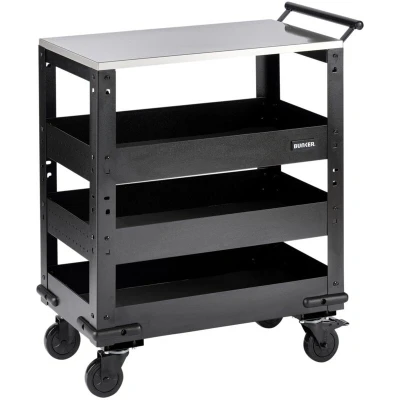 The BUNKER 3-tier trolley with a pull handle is equipped with a worktop. It allows you to keep your tools easily accessible no matter where you are in the workshop. Each of the three shelves is lined with EVA foam to protect your tools. The height of the middle tier is adjustable for added convenience. Additionally, the retaining lip on all levels ensures that even the smallest tools and parts do not roll away. The worktop provides extra space to work and offers more versatility. A strong steel handle and four hardwearing castor wheels ensure smooth maneuvering, while the two wheels fitted with brakes keep the trolley stationary when needed. For increased durability, the side bumpers reduce damage from impacts when moving it. All BUNKER® trolleys come with a 12-month warranty, extended to 10 years upon registration EVA foam lining on each shelf Retaining lip on all sides Stainless steel worktop Adjustable middle tier Measures W 714 x H 851 x D 410mm Dimensions: W 714 x H 851 x D 410mm