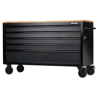 Are you looking for a stylish addition to your workshop? The 61"" BUNKER workbench roller tool cabinet might be just what you need. It features five drawers and a sturdy hardwood worktop, providing a versatile and high-quality workspace for assembling and working on projects. The roller tool cabinet is a robust solution, made of premium steel protected from scratches and everyday wear by industrial powder coating. Each drawer has an attractive anodised aluminum trim and is equipped with a smooth and quiet soft-close mechanism, as well as protective foam to keep your tools in great condition. The cabinet has four strong castor wheels and a side-mounted steel handle to make it easy to move around your workshop. Two of the wheels have brakes, keeping it stationary when you need it to stay put. For added security, the cabinet has an integral lock and comes supplied with two keys. All BUNKER® roller tool cabinets come with a 12-month warranty, extended to 10 years upon registration 5