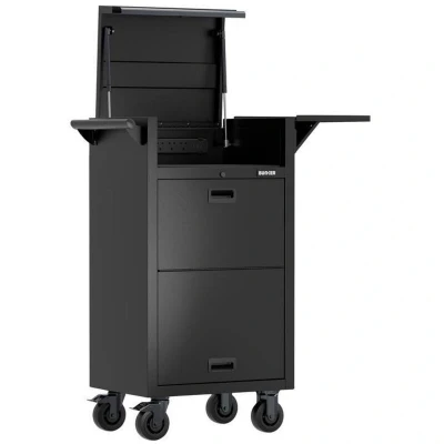 The BUNKER diagnostic trolley is made of steel and features a durable, industrial powder coated finish, making it perfect for busy workshops. It includes a top compartment with a lift-up lid that opens smoothly, supported by gas struts. Inside, there is a grommet for power access, a 3-way UK power strip with three USB ports, complete with a magnetic holder. The lockable front doors slide open to reveal a versatile arrangement of five drawers. There is thick EVA foam lining the top compartment and all drawers to protect tools and equipment. Additionally, there is a collapsible side table for laptop use. The trolley is designed for easy mobility around the workshop, featuring a side handle and sturdy castors, with two of the castors equipped with brakes. Dimensions: W 638 x H 1,197 x D 461mm Drawer load capacity: 45kg Top compartment load capacity: 50kg Side shelf load capacity: 12kg Weight: 67.6kg
