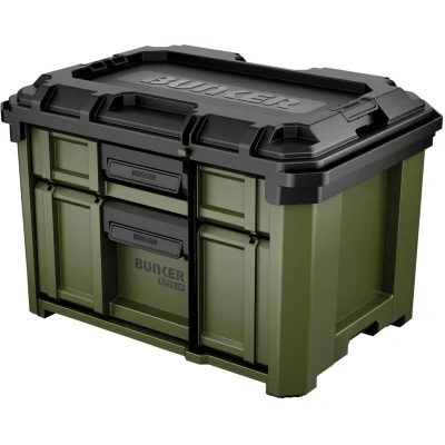 The BUNKER Load-Up Stacking Storage System offers the ultimate solution for organising, transporting, and securing your tools. Its modular design enables you to combine tool boxes, organisers and crates to create a customised stacking system that meets your specific needs. This drawer unit is constructed from high-impact resistant polypropylene. There are two drawers (3.5"" and 7"" deep) with dividers to enable organisation of contents. Each drawer has smooth operating sliders and auto-lock, to prevent the drawers opening on their own. For security, the system has a locking bar, which passes through to help deter theft and unauthorised access. The side rails for BUNKER Load-Up system accessories allow for further customisation and expanded storage options when used with BUNKER Load-Up Side Rail Hooks (Stock No. 31650). All BUNKER® storage comes with a 12-month warranty, extended to 10 years upon registration. Maximise your mobile tool storage and be ready for any job with the robust
