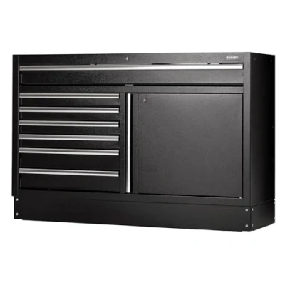 ManoManoPart of the BUNKER modular storage system. This stunningly designed premium-quality steel unit has seven drawers embellished with stylish aluminium handles. Each drawer has a smooth soft-close operation and is lined with lush foam to protect your tools. There is a cupboard offering excellent storage space with an adjustable shelf, accessible by a single cupboard door with aluminium handle. The feet of the cabinet are adjustable for optimal positioning on an uneven floor. The cabinet 8217;s matt black textured finish is highly durable, thanks to the industrial powder coating that protects against scratches, wear and corrosion. It has an integral lock for security and is supplied with two keys. The cabinet is delivered fully assembled and measures W 1360 x H 910 x D 468mm. It can be used as an individual storage cabinet in conjunction with either a stainless steel or hardwood worktop or as part of the BUNKER modular storage system, which includes 24 clever modular options. It comes