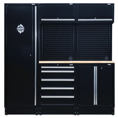 Part of the BUNKER® modular storage system. This stunningly designed combo is easily installed inside a garage or workshop to create your ideal storage system. All units are made from premium-quality steel and have a durable matt black textured industrial powder-coated finish. The floor cabinets are covered by a stylish hardwood worktop and provide incredibly versatile storage, featuring large cupboards with fully adjustable shelves and smooth soft-close drawers lined with lush foam to protect your tools. The fixed base cabinets have adjustable feet for optimal positioning on an uneven floor. All wall cabinets have lift-up doors for convenient access, operated by whisper-quiet gas struts. For added storage, the back panels act as pegboards, and each includes one pre-cut hole for access to a power supply. Each unit has an integral lock for security and two keys are supplied. The combo comes with all the required fittings for simple installation. For your quality assurance, all BUNKER® units include a 10-year warranty. Every combo includes a free magnet of the distinctive BUNKER® logo.