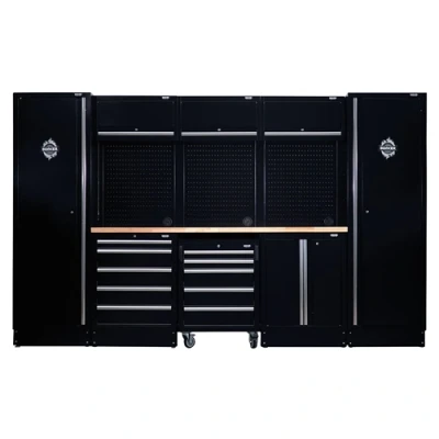 Part of the BUNKER® modular storage system. This stunningly designed combo is easily installed inside a garage or workshop to create your ideal storage system. All units are made from premium-quality steel and have a durable matt black textured industrial powder-coated finish. The floor cabinets are covered by a stylish hardwood worktop and provide incredibly versatile storage, featuring large cupboards with fully adjustable shelves and smooth soft-close drawers lined with lush foam to protect your tools. There is also a mobile cabinet with five drawers. The fixed base cabinets have adjustable feet for optimal positioning on an uneven floor. All wall cabinets have lift-up doors for convenient access, operated by whisper-quiet gas struts. For added storage, the back panels act as pegboards, and each includes one pre-cut hole for access to a power supply. Each unit has an integral lock for security and two keys are supplied. The combo comes with all the required fittings for simple installation. For your quality assurance, all BUNKER® units include a 10-year warranty. Every combo includes a free magnet of the distinctive BUNKER® logo.