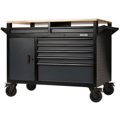 Part of the BUNKER® storage range. This robust 48" multifunctional mobile cabinet offers excellent tool storage and workspace capabilities. It has access from both sides and includes 14 drawers, a worktop and a double-sided storage cupboard with a shelf. There are also pegboards on the two side panels for hanging tools and equipment, with a paper towel holder and ample space for storing cans. Made from premium-quality steel, the unit has a matt grey textured finish which is highly durable, thanks to the industrial powder coating that protects against scratches, wear and corrosion. This stylish look is further enhanced with a black anodised aluminium trim. Each drawer has a smooth soft-close operation and is lined with lush foam to protect your tools. The 25mm-thick hardwood worktop spans the whole surface of the unit, providing a handy workspace. For ease of manoeuvrability, there is a steel handle and four durable castor wheels. Two of the wheels are fitted with brakes to keep the tool cabinet still. It has an integral lock for security and is supplied with two keys. The unit requires partial assembly and measures W 1,430 x H 1,009 x D 800mm. For your quality assurance, all BUNKER® units include a 10-year warranty.