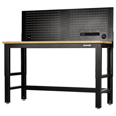 Discover the BUNKER 1550mm workbench, designed with built-in electrical access for power tools. A choice of hardwood or stainless steel worktops adds a stylish touch and the steel pegboard features an integrated power strip with two rubber grommets for easy power access. This workbench is height adjustable for user comfort and includes adjustable feet to ensure stability on uneven surfaces. All BUNKER® workbenches come with a 12-month warranty, extended to 10 years upon registration Height adjustable workspace Hardwood worktop Steel pegboard and integrated powerstrip with 3 sockets and USBs Adjustable feet for optimal positioning Ready to assemble design Dimensions: W 1,830 x D 610mm Height adjustable: 760-1,065mm Height including pegboard: 1,268-1,572mm