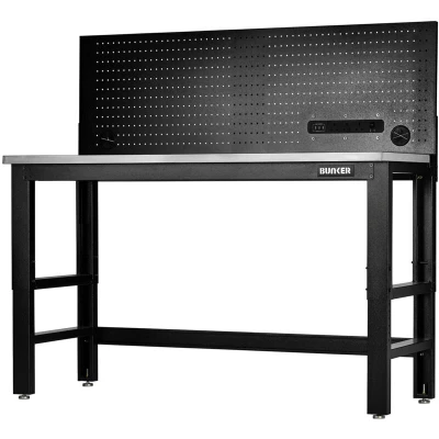 Discover the BUNKER 1550mm workbench, designed with built-in electrical access for power tools. A choice of hardwood or stainless steel worktops adds a stylish touch and the steel pegboard features an integrated power strip with two rubber grommets for easy power access. This workbench is height adjustable for user comfort and includes adjustable feet to ensure stability on uneven surfaces. All BUNKER® workbenches come with a 12-month warranty, extended to 10 years upon registration Height adjustable workspace Stainless steel worktop Steel pegboard and integrated powerstrip with 3 sockets and USBs Adjustable feet for optimal positioning Ready to assemble design Dimensions: W 1,830 x D 610mm Height adjustable: 760-1,065mm Height including pegboard: 1,268-1,572mm