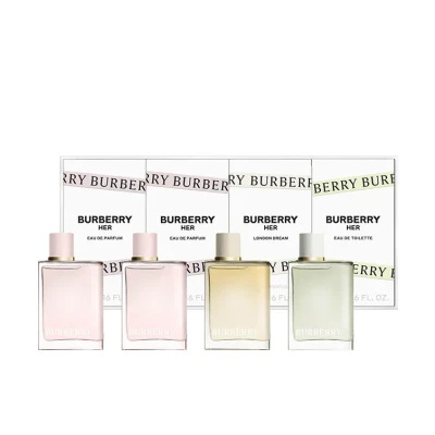 #html-body [data-pb-style=FPMWB96]{justify-content:flex-start;display:flex;flex-direction:column;background-position:left top;background-size:cover;background-repeat:no-repeat;background-attachment:scroll}Burberry Mini Gift Set (4 x 5ml) presents a selection of four quintessential scents from the renowned British fashion house, capturing the essence of classic elegance and modern sophistication... Collection Contains: 1 x Burberry Her Eau De Parfum (5ml) - a fruity gourmand scent that bursts with Red and Dark Berries, melded with Jasmine and Violet, and finishes with a base of Amber and Musk for an addictive and sensual aroma.1 x Burberry Her London Dream Eau De Parfum (5ml) - an invigorating fragrance that combines fresh notes of Ginger and Lemon with the delicate beauty of Rose, creating a free-spirited and luminous scent.1 x Burberry My Burberry Eau De Toilette (5ml) - this fragrance captures the essence of a London garden after the rain with notes of Sweet Pea and Bergamot complemented by Geranium Leaf, Quince, and Freesia, grounded in a base of Patchouli and Roses.1 x Burberry My Burberry Blush Eau De Parfum (5ml) - a fruity floral scent that opens with Pomegranate and Lemon, blends into a heart of Geranium, Apple, and Rose, and finishes with a base of Wisteria and Jasmine, offering a fresh and vibrant allure.