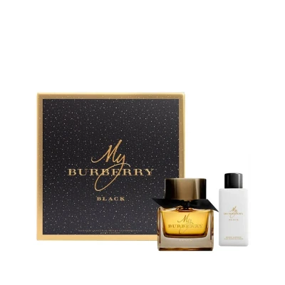 Burberry My Burberry Black Gift Set 50ml EDP + 75ml Body Lotion. My Burberry Black by Burberry is an oriental and floral fragrance for women. A stunning, heavy flacon with a dark tint and a black ribbon tied around the neck containing a soft, sexy and a slightly dark liquor. You’ll find delicious peach in the opening that soon softens with hints of amber and fruits. Accords of rose also sit warm on your skin and harmonise perfectly with exquisite patchouli.