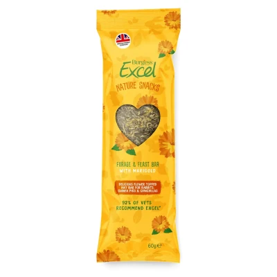Burgess Excel Forage And Feast Bar Marigold 60g is a natural snack for guinea pigs, rabbits, and small animals, made with 73.3% meadow hay and dried marigold flowers to support dental and digestive health. Free from artificial flavours or preservatives, it offers a high-fibre, wholesome treat.