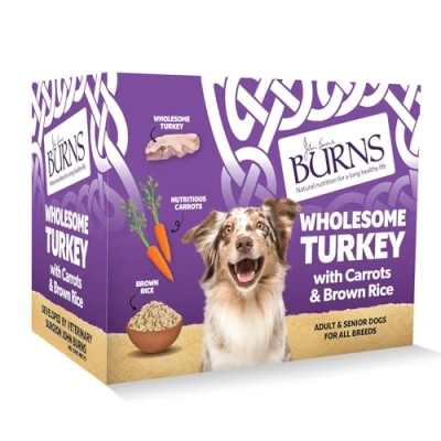 Our complete Burns wet food contains only wholesome ingredients such as wholegrain brown rice, carrots, vitamins and minerals. Comes in several tasty varieties including free-range chicken, hearty lamb, wild fish and wholesome turkey. This specific 6 pack of wet dog food contains some terrifically tasty turkey. A convenient alternative to home cooking that will get tails wagging. Our Hypoallergenic food is suitable for adult and senior dogs of any breed, fussy eaters and dogs with sensitive skin and digestion. Made without ingredients that commonly cause intolerance such as beef, wheat, soya and dairy. We only use natural ingredients, with no mystery meats, cheap fillers, or artificial colours, flavourings or preservatives. This means our food is highly digestible, creating less waste and offering great value. Our most sustainable food to date – cooked in Wales and where possible made with responsibly sourced ingredients from British and Irish farms. We won a Highly Commended award in the 'Your Dog' Best Wet Food category in 2025. Packaging may vary.