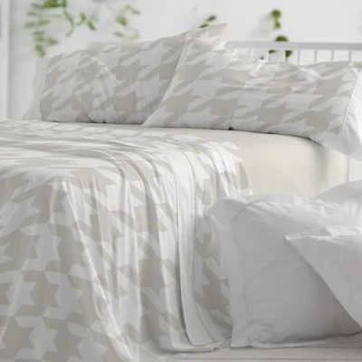 PRODUCT - 100% COTTON Sheet Set with a shaky geometric print, XL houndstooth in pastel khaki on a white background. Embozo in white and pastel khaki printed trim. Fitted bottom sheet in pastel khaki. Pillow printed like the sheet and inserts in white. Dimensions of the set: a worktop measuring 240 x 270 cm. Two pillowcases 50 x 85 cm. One fitted sheet 150-160 x 190/200 cm. Available in various sizes. Features: 100% extra soft cotton fabric. Easy ironing. It is recommended to wash before first use. Long lasting. High mattress of 32 cm..A single pillowcase of 90,105,135 mm and two pillowcases for beds of 150/160,160,180 and 78.7 cm. in..Stamping A Single sided. Available in duvet cover MATERIAL: The fabric on which this sheet is made is 100% cotton with 144 thread count. A quality product, endorsed by Burrito Blanco. An initial gentle wash is recommended to acquire its ultimate touch and softness characteristics. MAINTENANCE: Machine wash with delicate program and maximum temperature of 40º. Do not bleach. Iron on medium heat. Do not dry clean. Machine dry, normal cycle